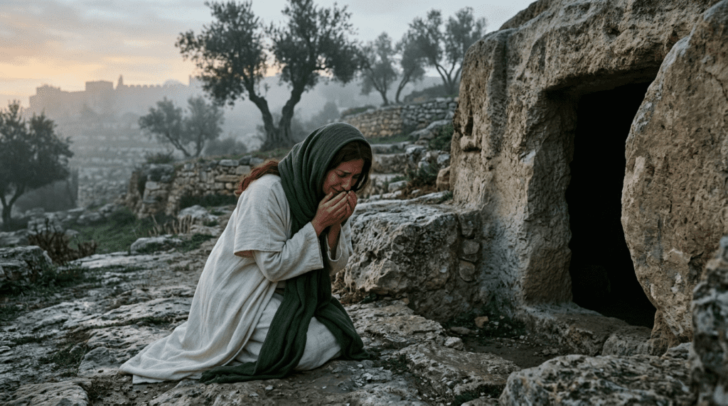 Os discípulos constataram o ocorrido e retornaram às suas próprias casas. Maria Madalena, porém, ficou do lado de fora, chorando. E enquanto chorava, olhou para dentro da sepultura e viu dois anjos de branco sentados.