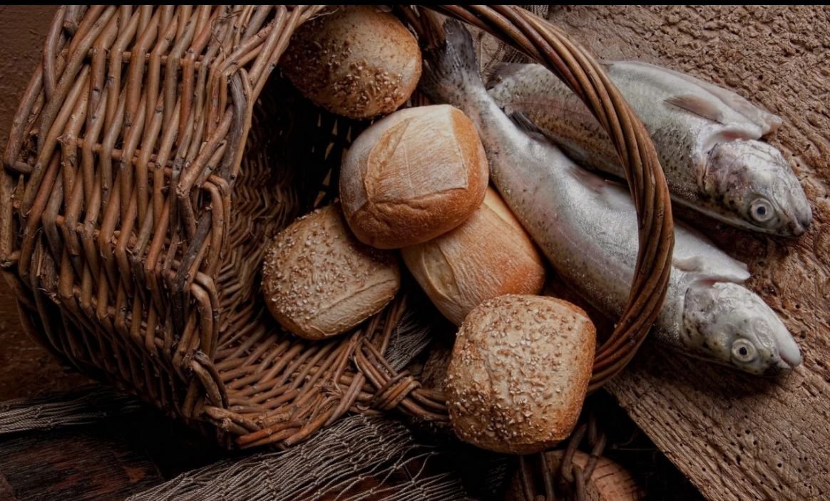 “Então Jesus tomou os pães, agradeceu a Deus e os repartiu entre o povo. Em seguida, fez o mesmo com os peixes. E todos comeram à vontade.”